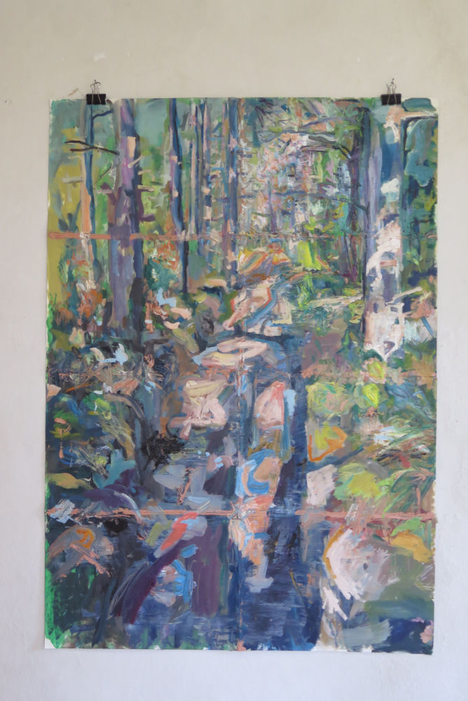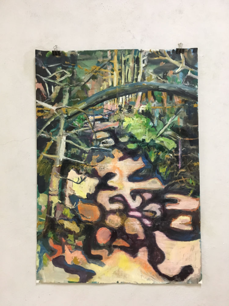 Anne Staszkiewicz ist Malerin. Für ihre Residenz in Die/Frankreich hatte sie das Projekt in der Natur zu malen, ganz wie die Maler der Schule von Barbizon im 19. Jahrhundert. Ein diametraler Gegensatz zu ihrem sehr urbanen Atelier in Berlin Wedding. Der schönen Natur des Diois ausgesetzt, ist Anne gleich gefangen von der Kraft der Berge mit ihrer Felsen, dem Spiel ihrer Farben und Schatten, welche sich bei jedem Blick ändern. Doch die Natur imponiert vielleicht zu viel, verlangt zu viel. Möchte ihr hübsches Bild als Postkarte. Hinzu kommt, dass man, um in der Natur zu malen, immer so viele Dinge mit sich rumschleppen muss… Und so findet sich Anne mehr oder weniger in gewohnter Arbeitsweise wieder – mit all ihren präparatorischen Skizzen und handlichen Ölbildern und vielen Fotos als Stütze und Erinnerung. Jetzt ist es weniger die Natur an sich, mit der sie ringt (auf dem Foto bewegt sich nichts mehr), als vielmehr mit ihren eigenen Vorschlägen auf Papier und Leinen. Denn die Malerei ist stets eine Herausforderung, ein Balanceakt von Farben, Energien, Launen und Humor. Die Berge, die Bäume, die Äste und ihre Schatten wandeln sich nun vom Motiv zu einem bloßen Vorwand, um zu malen, um Kunst zu machen. Ohne die Einschüchterung durch die Natur findet die Malerei von Anne Staszkiewicz ihre Freiheit wieder und ganz neue Dinge ereignen sich. Nach ihren Studien von Bergen und Felsreliefs beginnt die Künstlerin erstmals abstrakt zu malen, und in der Serie „Landkarten eines Expressionisten“ ergießt sich ein Strom von Ornamenten. Zum ersten Mal drängt sich das Ornamentale nach vorne, das bisher von Annes Malerei ausgeschlossen war, vor allem, „da es zu feminin ist“. Um in der Kunstwelt zu reüssieren, sollte man schließlich besser ein Mann sein… Daher schickt Anne auch einen Expressionisten, ein männliches Alter Ego, um im Diois für sie zu malen.