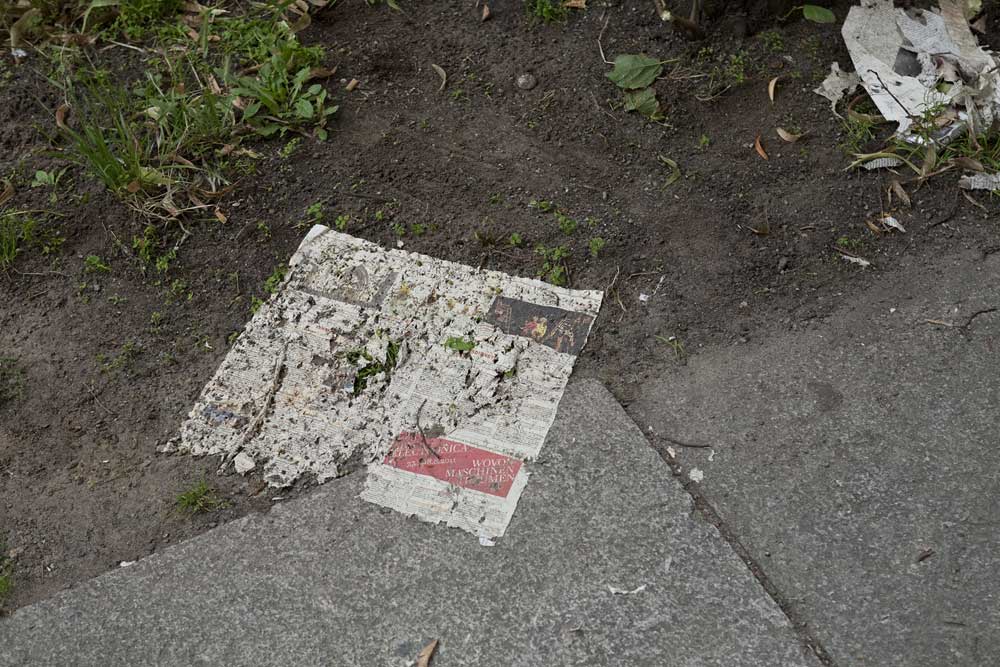 Im Juli war Roman Pfeffer zu Gast in den Lichtenbergstudios und realisierte 16 verschiedene Interventionen. Deren Grundlage waren unter anderem die Vegetation, Ordnungssysteme und vorgefundene Materialien, die von Passanten entsorgt wurden. Der Fundus an Materialien war reichlich, da das aus der Hand Gleiten von Dingen, die man nicht mehr benötigt, in Lichtenberg zum guten Ton gehört. Laut seinen Beobachtungen sind es nicht nur die unzähligen Biervernichter, die schon am Morgen die Sitzzonen des Stadtteils bevölkern, sondern der Materialverlust zieht sich durch alle Bevölkerungsschichten. Der Charme dieses Stadtteils in seiner Vielschichtigkeit hat dem Künstler eine interessante Basis für die künstlerische Arbeit geboten.
