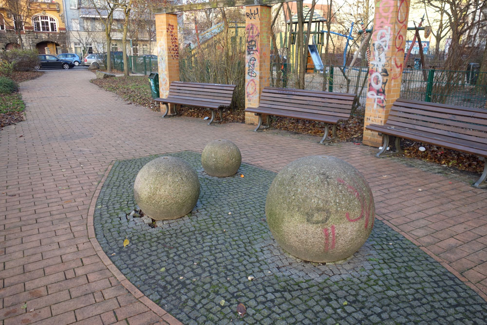 erschließt: in der Nöldnerstraße 15/16 zieren je 3 Kugeln aus Stein die Fassaden der ehemaligen