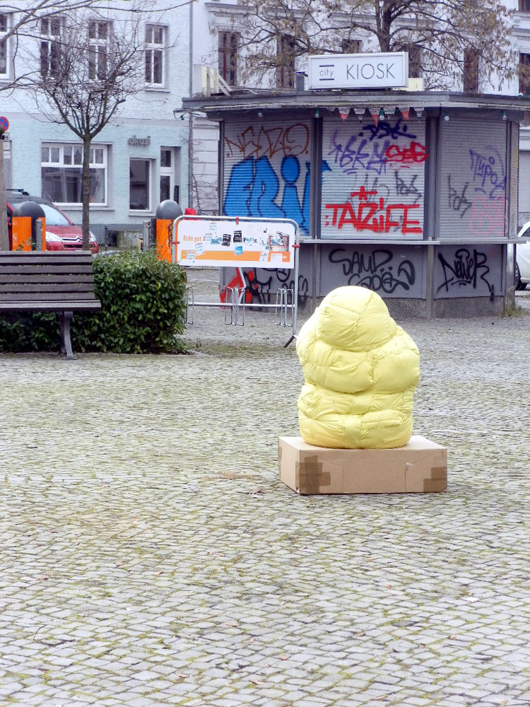 Weil diese weiblichen Körper, die ich auf meinen Spaziergängen durch Lichtenbergs wahrnehme, angegriffen und deformiert wurden, formt sich in mir langsam eine Bildvorstellung für eine temporäre urbane Skulptur. Eine Skulptur aus Stoff, wolkenhaft, aber gegen äußere Umstände resistent. Einem Dummy ähnlich, der nach Stößen von Außen seine ursprüngliche Form wieder annimmt. Meine Female Sculpture ist ein amorphes gelb-grünes Stoffbündel, ein Gedanke – ein unfertiges Manifest.