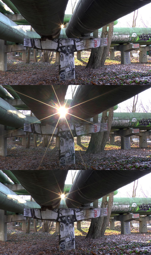 Sprühbilder. Die tiefstehende Wintersonne blitzt in Durchblicken und Betonlücken auf. Nachts