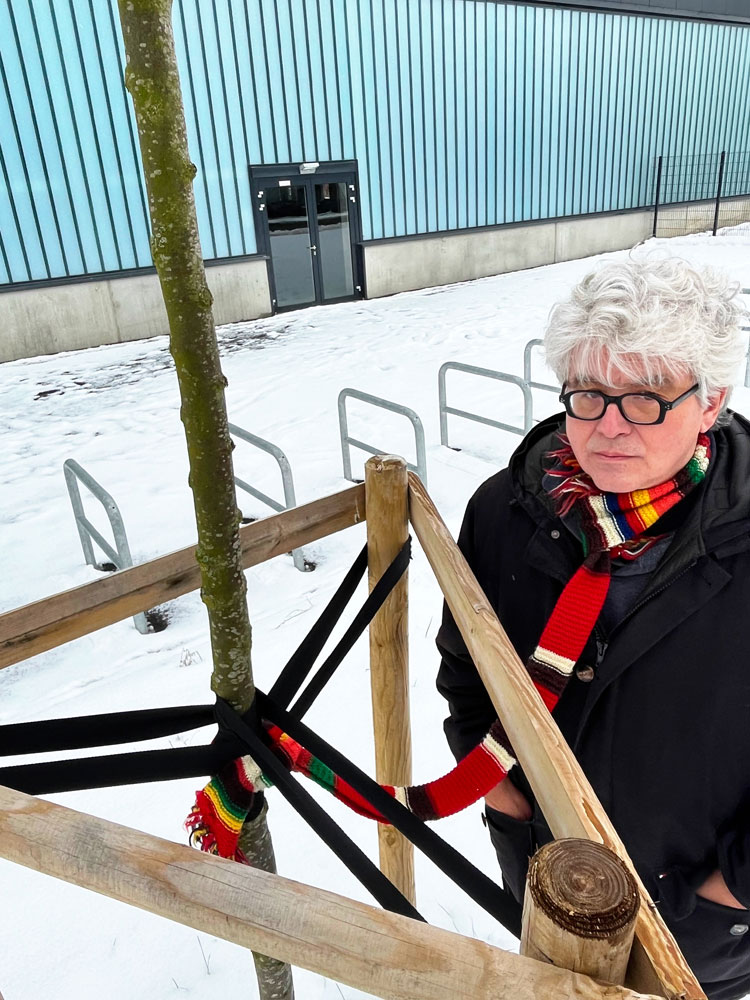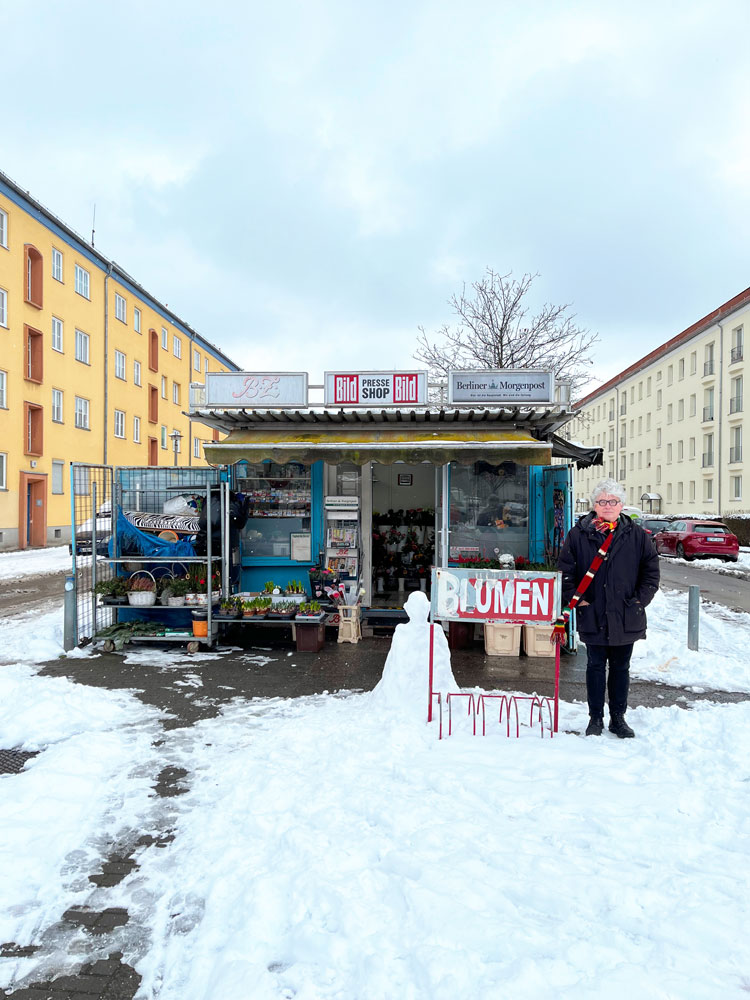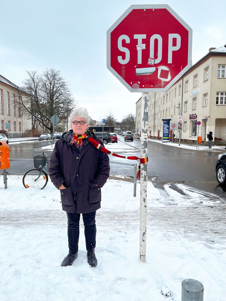 Mein Freund Uwe, Kurator der Lichtenberg Studios, findet meinen Strickschal scheußlich. O-Ton: „Ich würde niemals so rumlaufen. Aber selbst wenn ich auf die Idee käme – meine Freundin würde sich schlichtweg weigern, mit mir auszugehen.“ Das brachte mich auf die Idee zu LICHTENBERG-CONNECTED: Mittels Schal gehe ich eine innige Verbindung mit ausgewählten Objekten im Berliner Bezirk Lichtenberg ein. Es sind Brückenschläge, die mich mit dem urbanen Environment im wahrsten Sinne des Wortes verknüpfen. Das Projekt bildet den Abschluss meiner Residency in den Studios. Meine Intention ist es, Uwe und der Welt vor Augen zu führen, wie gut mir und Lichtenberg der Schal zu Gesicht steht. Voila!