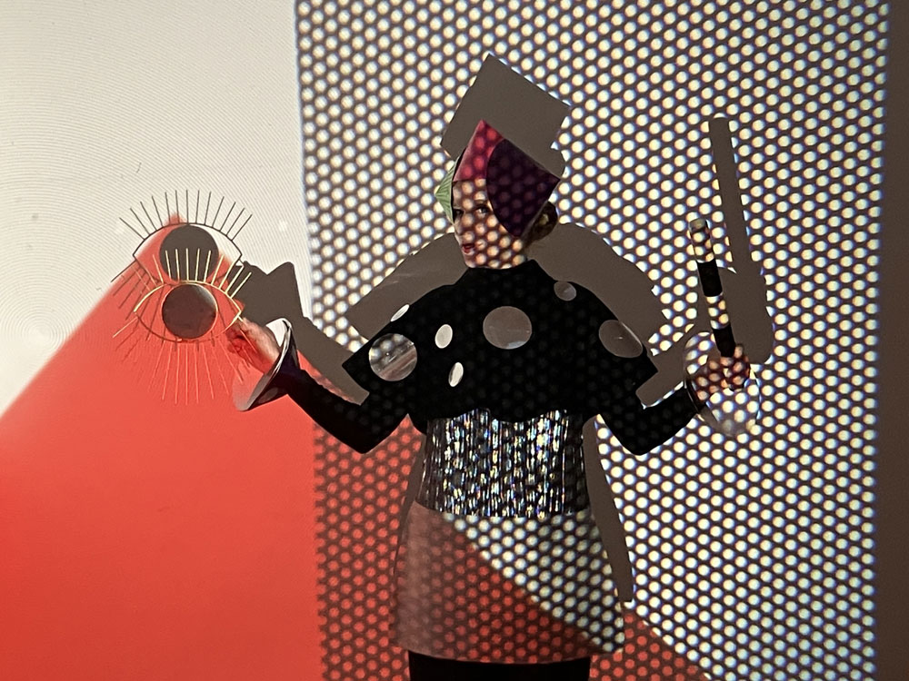 Collaborating with Emily Goodwin, a performance artist and costume maker, and adopting the methodology of the flâneuse, we centralised a form of urban wandering alert and attuned to the hidden corners and edges of the city. Through this process of perambulation, we surveyed a number of intriguing spaces within Lichtenberg, where we planned to stage performative interventions that would be captured on 16mm film, and might distil a sense of our psychogeographical investigations of presence, memory and place. Through the fortuitous discovery of an apartment block designed by the Bauhaus artist Oskar Schlemmer, and following further research into his dynamic performances, we were inspired to create a series of bodily sculptural forms that would operate in visual dialogue with his Triadic Ballet piece. Emily crafted brightly coloured conical forms to sheath her arms, a headpiece, corrugated neck ruff and fanned ankle cuffs, all using found, recycled or repurposed materials. These adornments restricted her regular range of movements, which led us to consider the costume elements as a form of wearable sculpture, offering occasion to experiment with alternative motions, gestures and forms of physical expression. These movements operated in